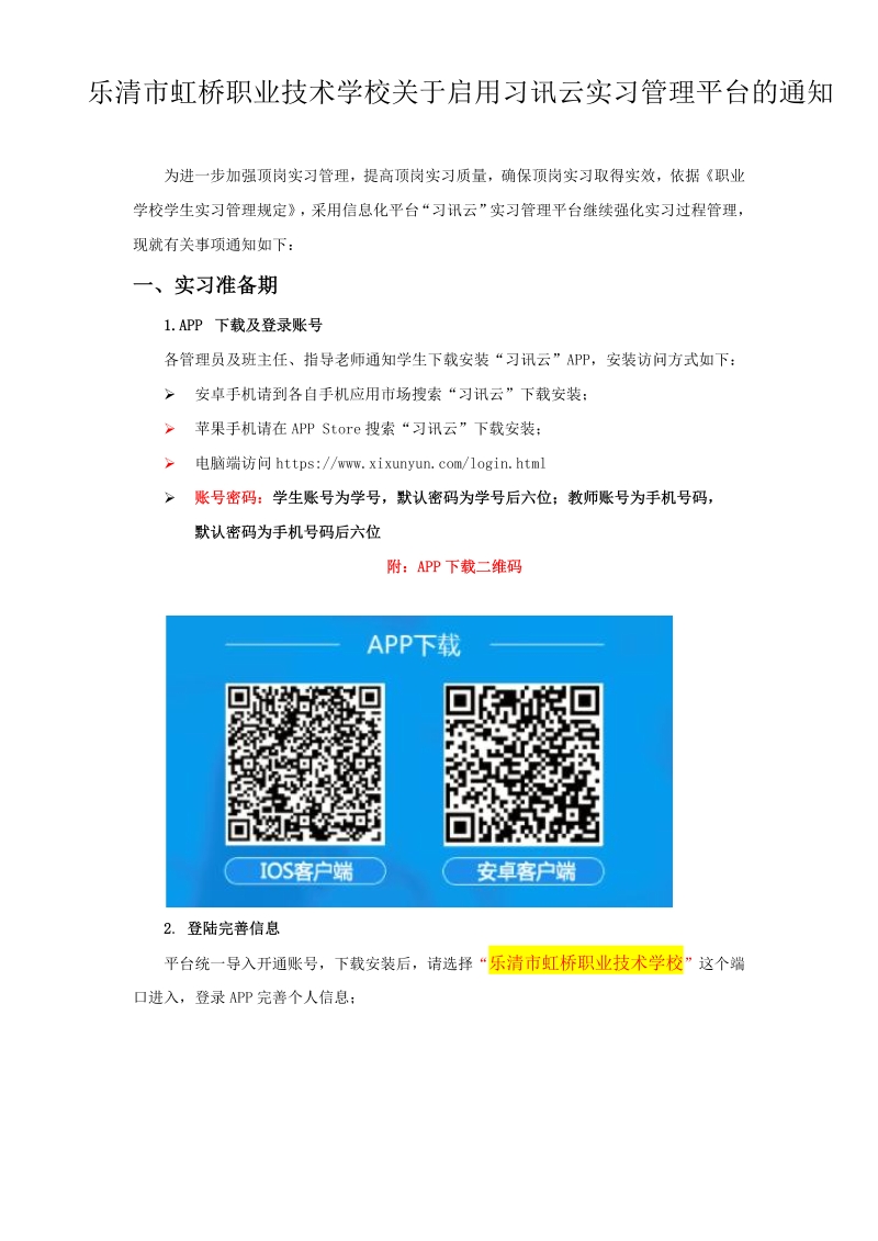 乐清市虹桥职业技术学校关于启用习讯云-实习管理平台加强实习过程管理的通知