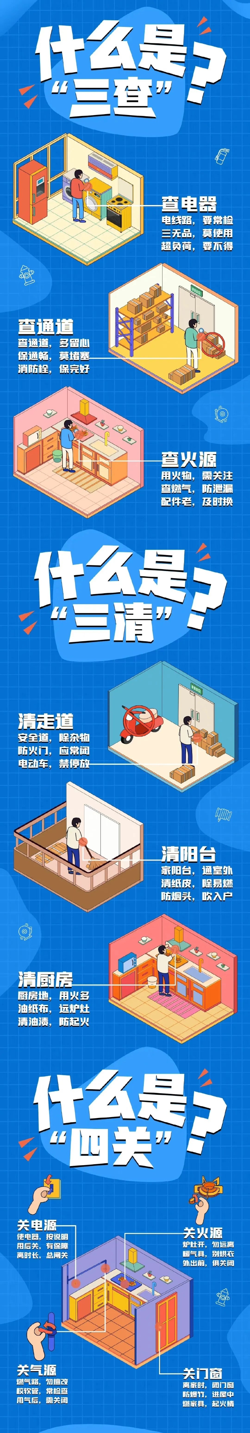 节假日期间,不管居家还是出门,都别忘了防范家庭火灾要做好“三查三清四关”,即查电器、通道、火源,清走道、阳台、厨房,离家时关电源、火源、气源、门窗。防火没有旁观者,你我都是践行人!23