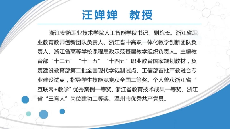 接着她从专业基本情况、人才培养设计、专业建设成效、产教融合探索、中高职一体化五个方面进行交流分享。